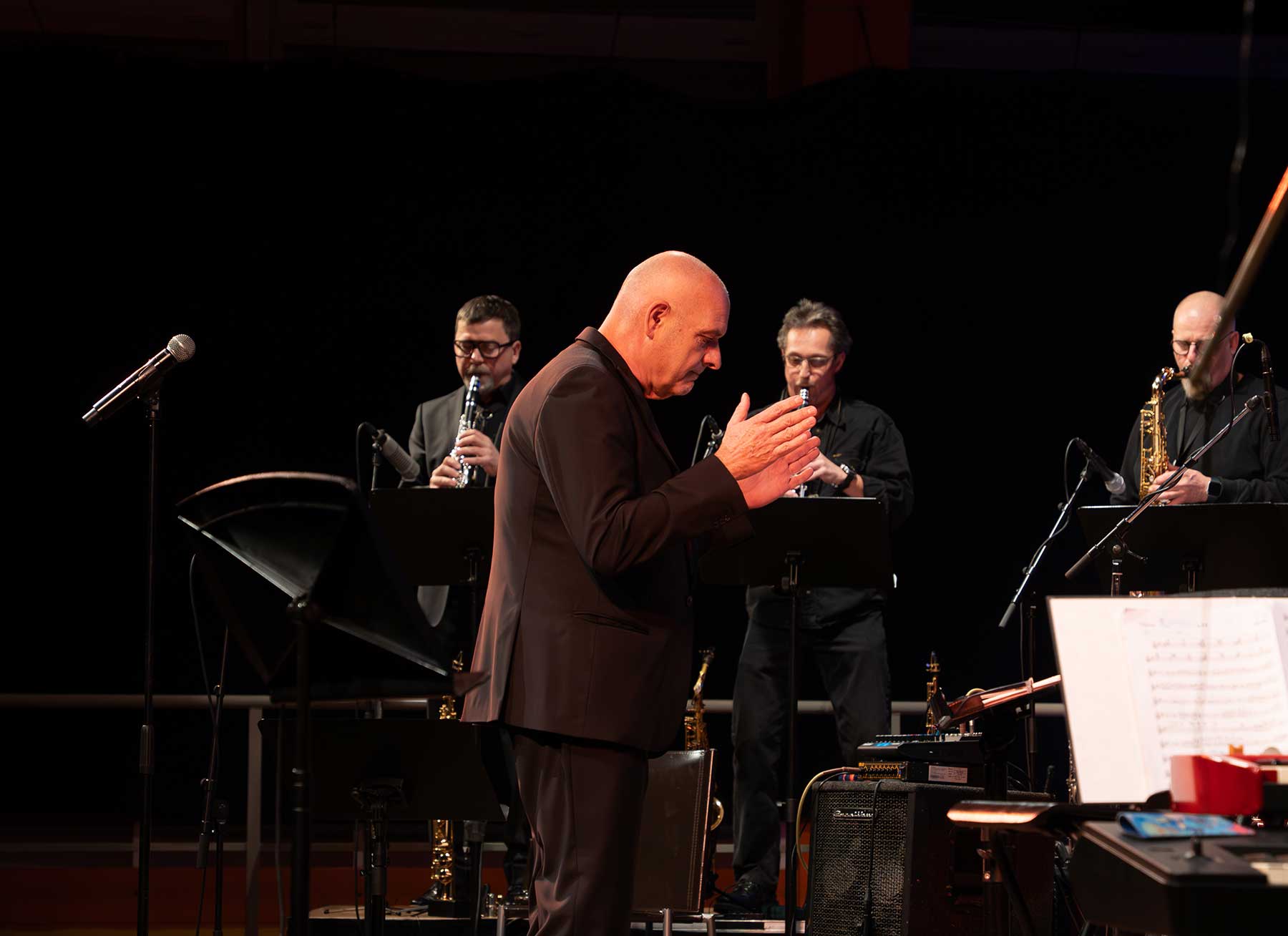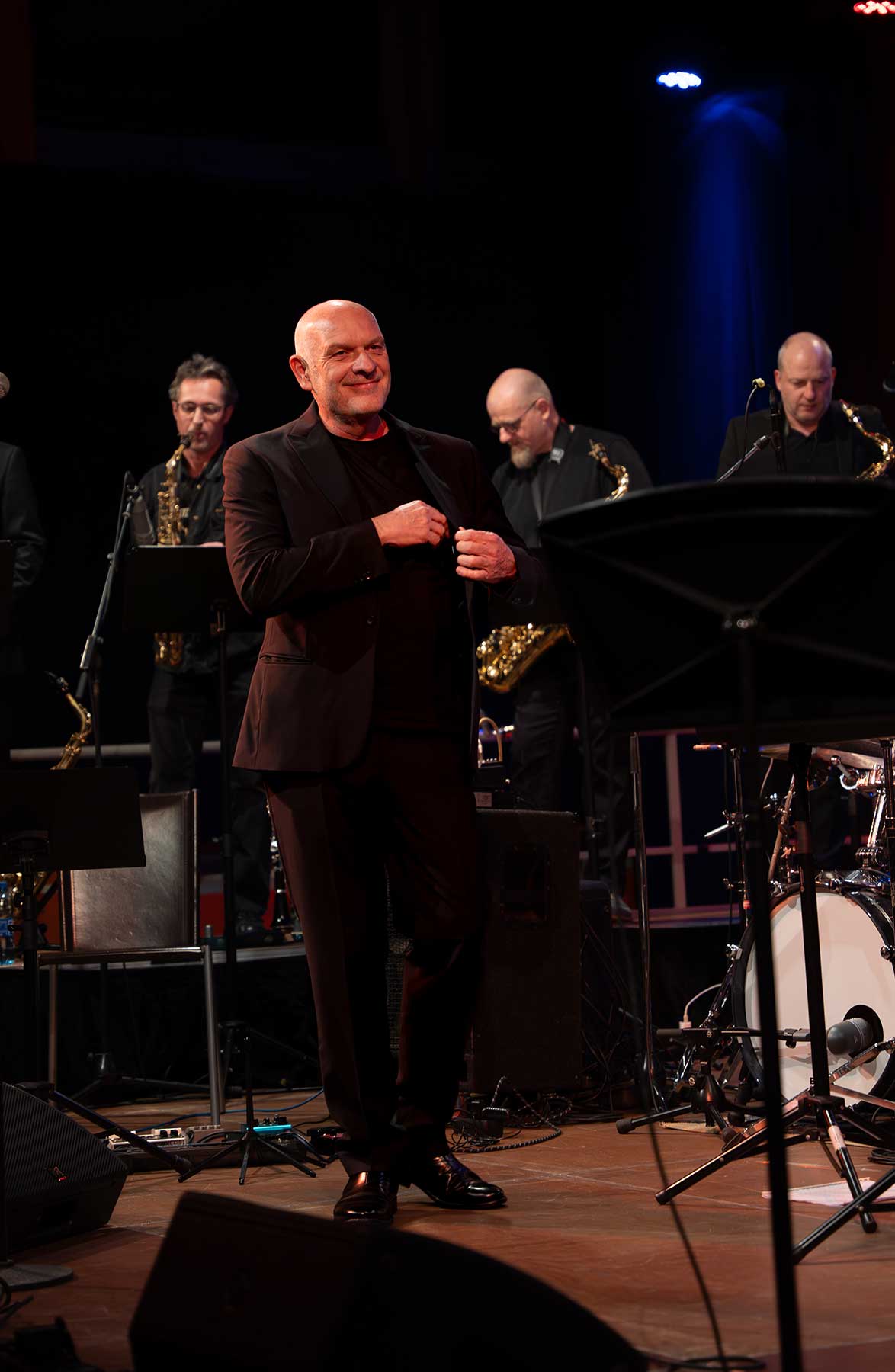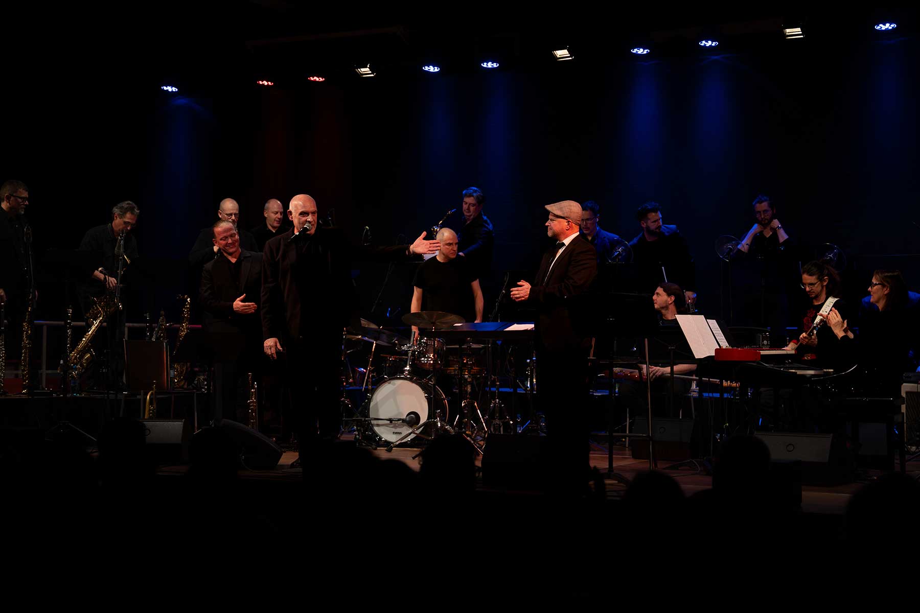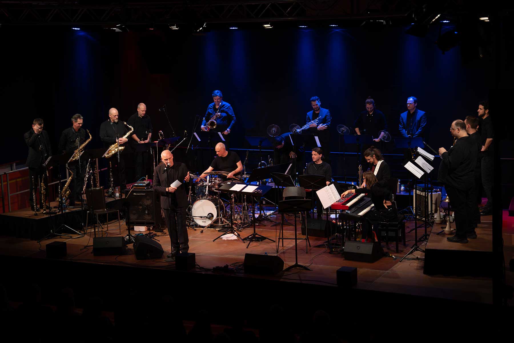 Mittendrin und an vorderster Front: Lorenz Raab, Freund und Wegbegleiter von Bandleader Alois Aichberger, der mit seiner Trompete malte wie andere mit Aquarellfarben. Ebenso großartig: Julia Sitz, die mit ihrer Stimme die vielfältigen Stücke veredelte und damit für einige der vielen Gänsehautmomente des Abends sorgte. Einer der berührendsten Momente war sicher „Die notwendige Reise“ – eine Komposition für Sprecher (Peter Hofmayer) und Big Band über Menschen auf der Flucht, aus dem Album „Sounds of Kosovo“. Inmitten aller Feierlichkeit ein nachdenklicher, emotionaler, intensiver Moment.