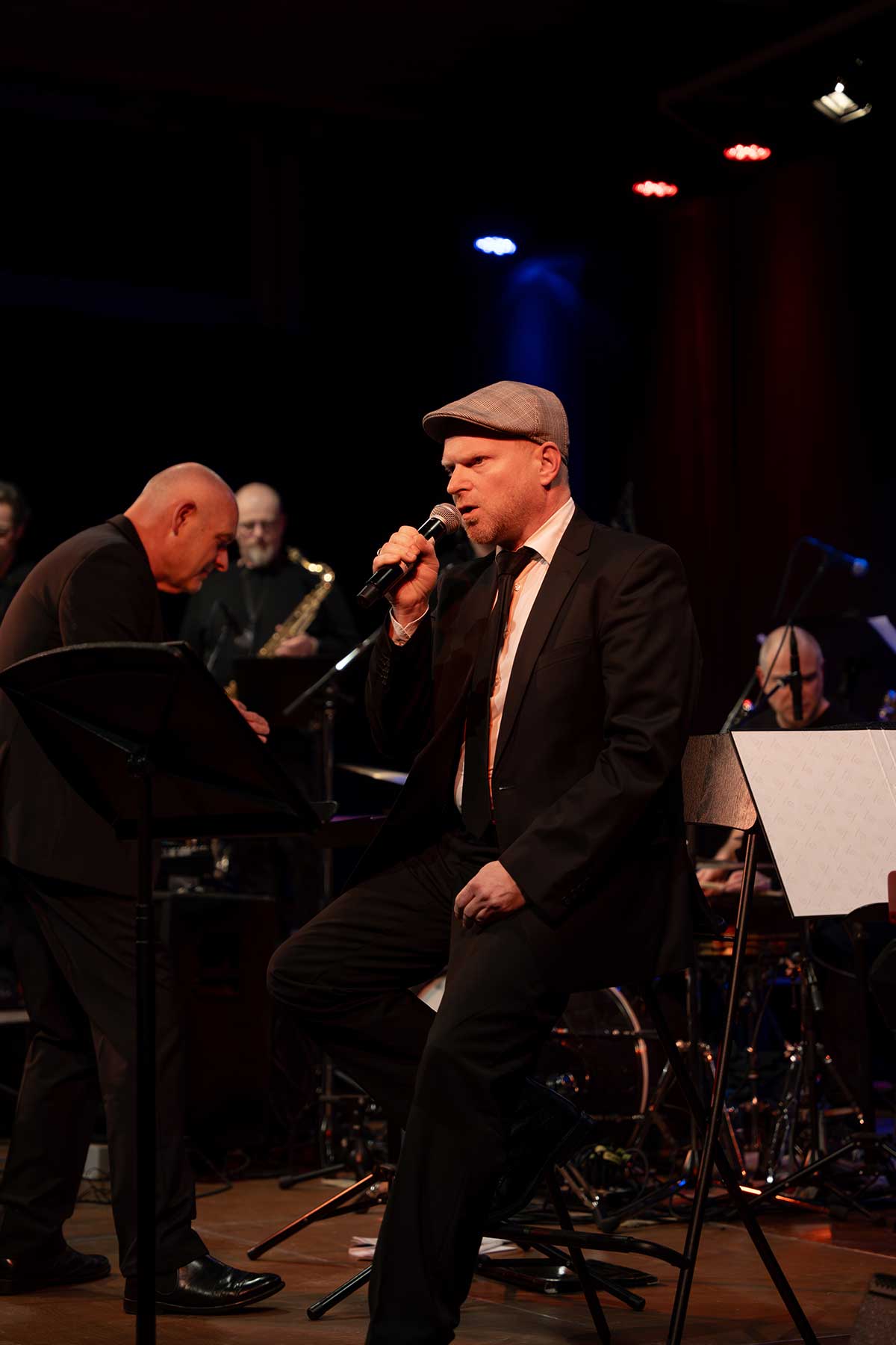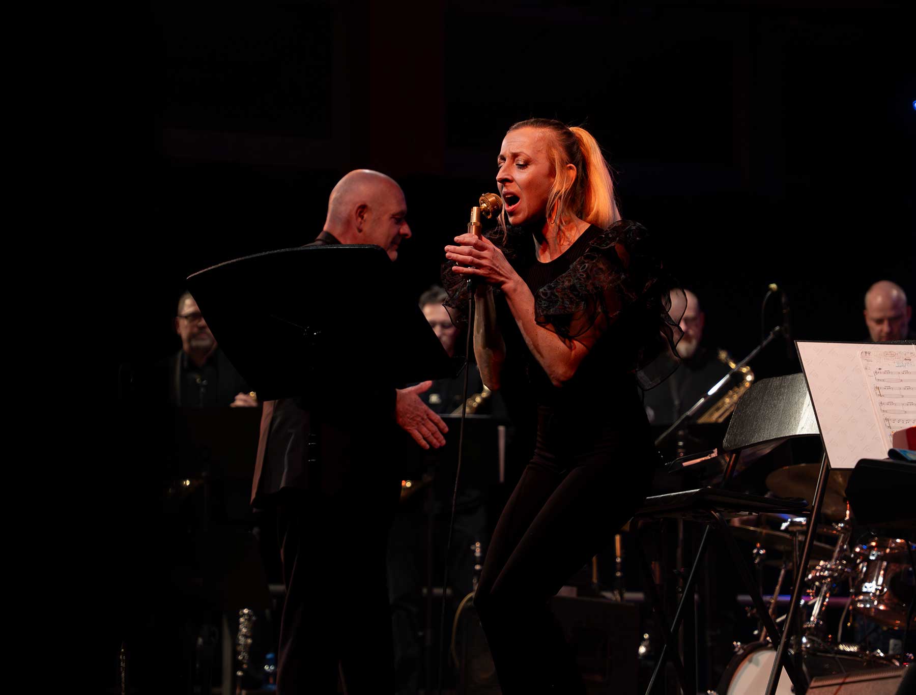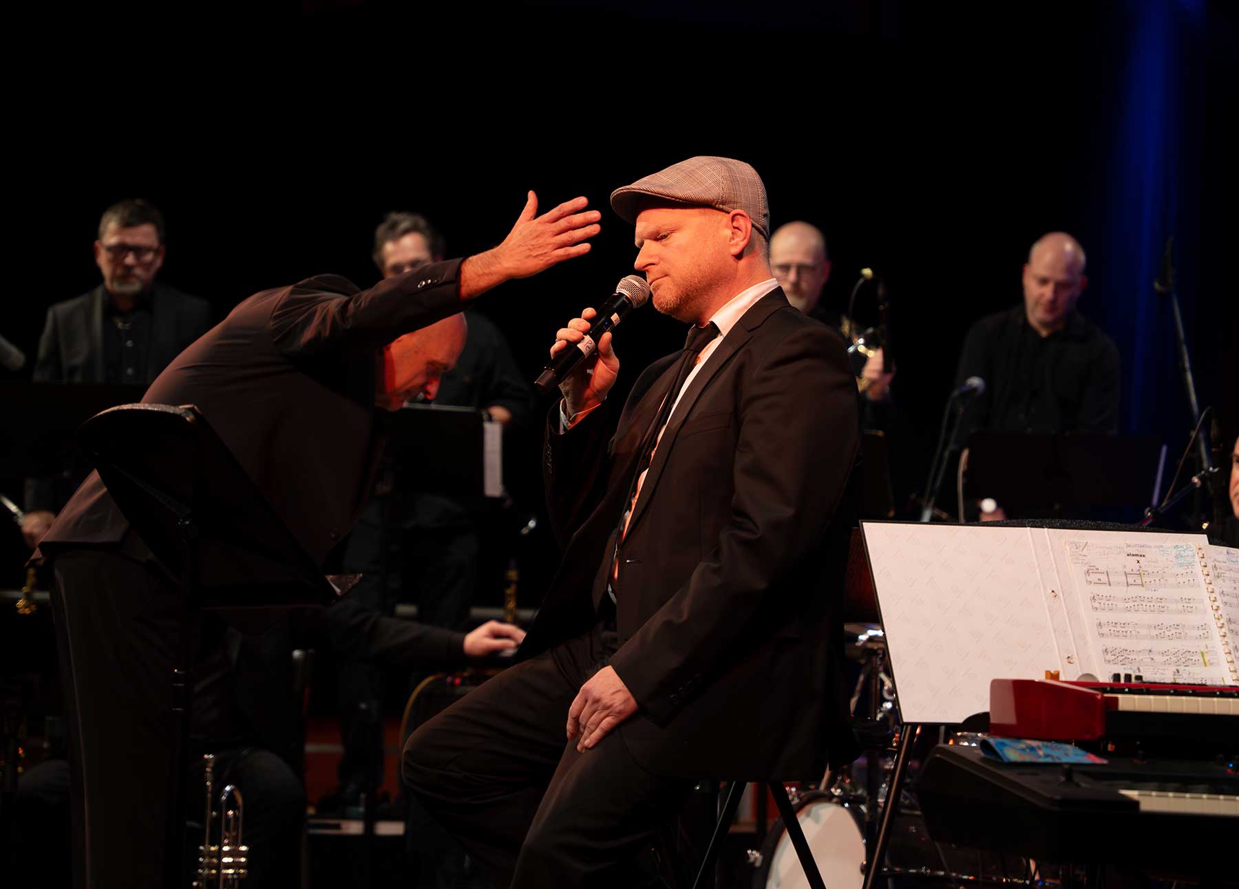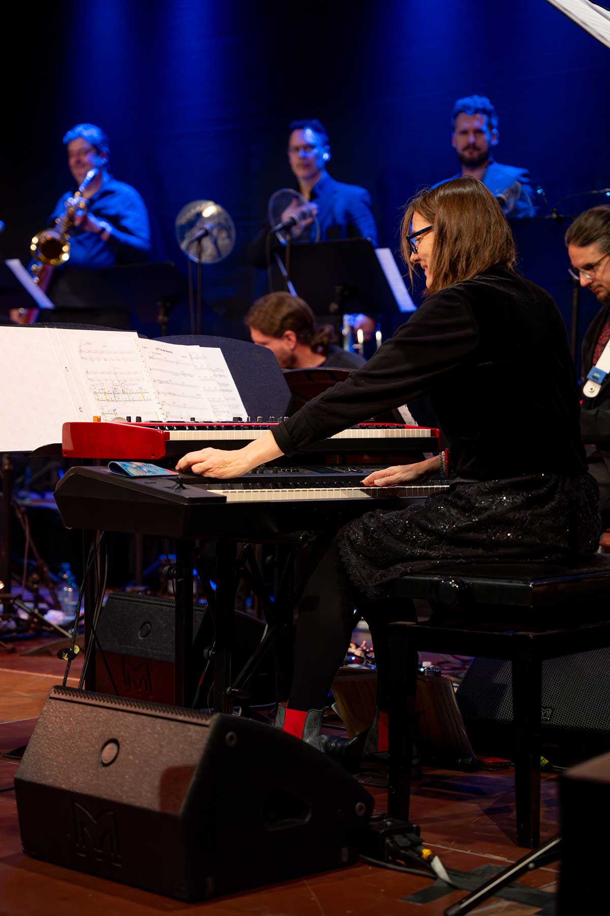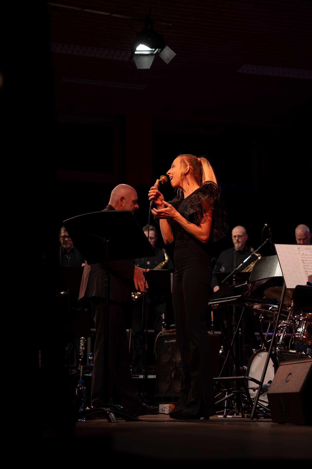 Mittendrin und an vorderster Front: Lorenz Raab, Freund und Wegbegleiter von Bandleader Alois Aichberger, der mit seiner Trompete malte wie andere mit Aquarellfarben. Ebenso großartig: Julia Sitz, die mit ihrer Stimme die vielfältigen Stücke veredelte und damit für einige der vielen Gänsehautmomente des Abends sorgte. Einer der berührendsten Momente war sicher „Die notwendige Reise“ – eine Komposition für Sprecher (Peter Hofmayer) und Big Band über Menschen auf der Flucht, aus dem Album „Sounds of Kosovo“. Inmitten aller Feierlichkeit ein nachdenklicher, emotionaler, intensiver Moment.