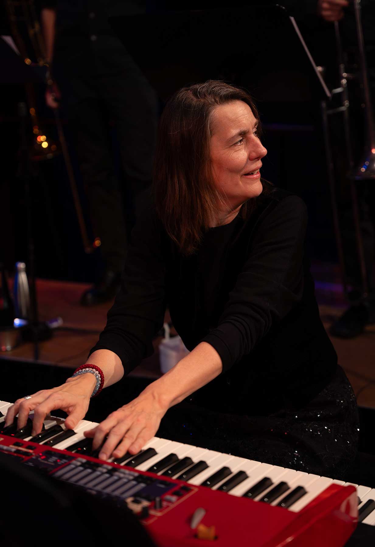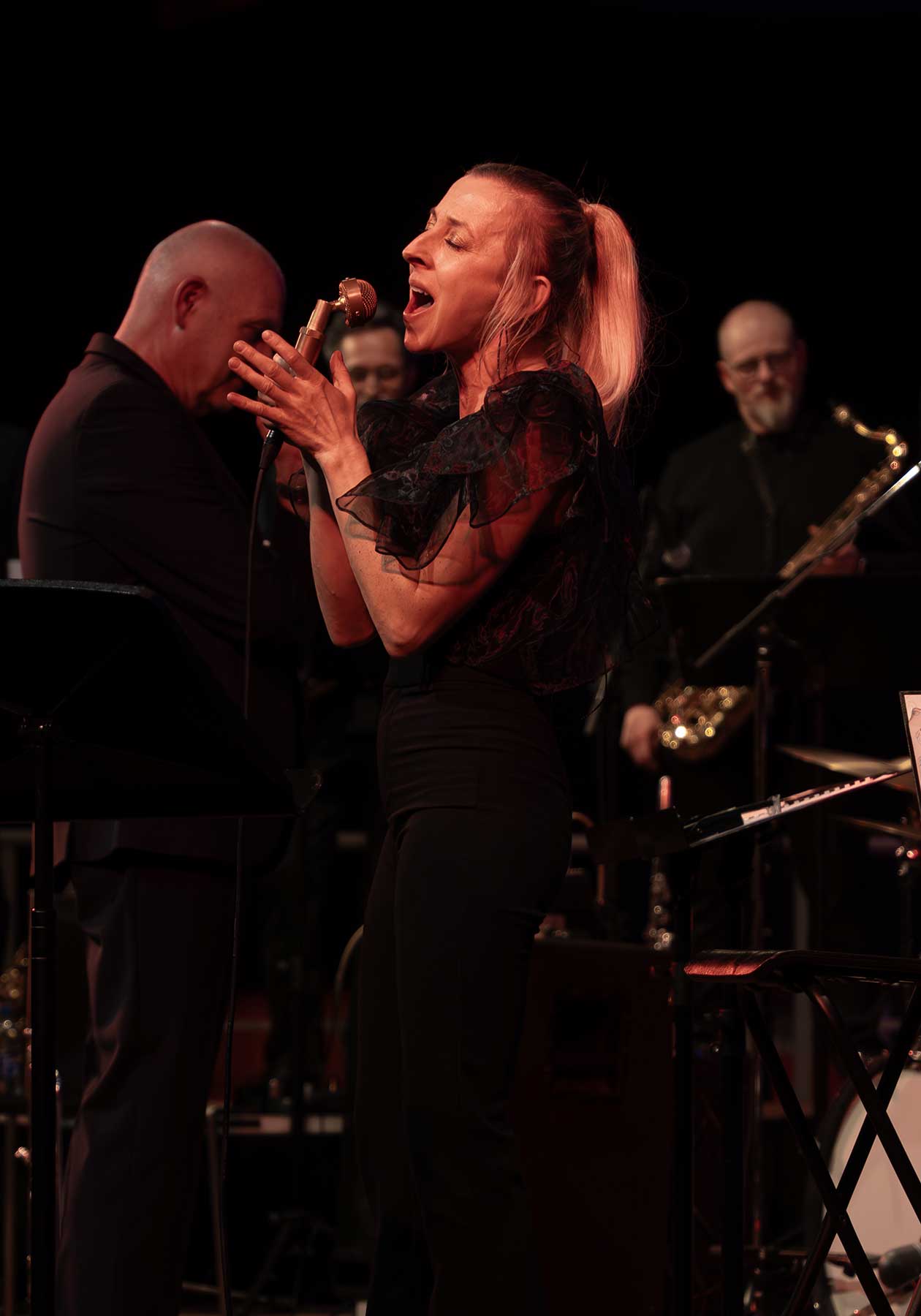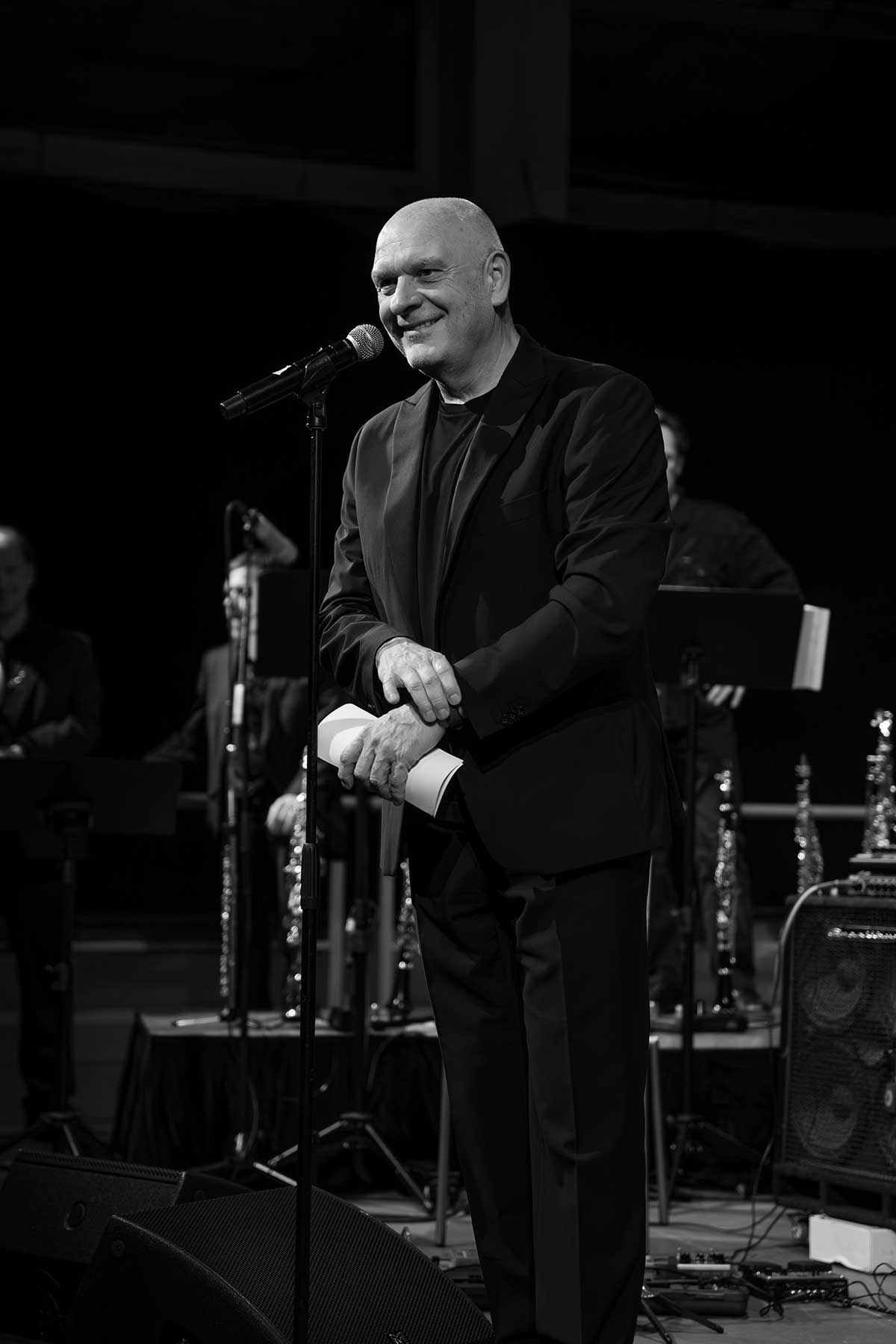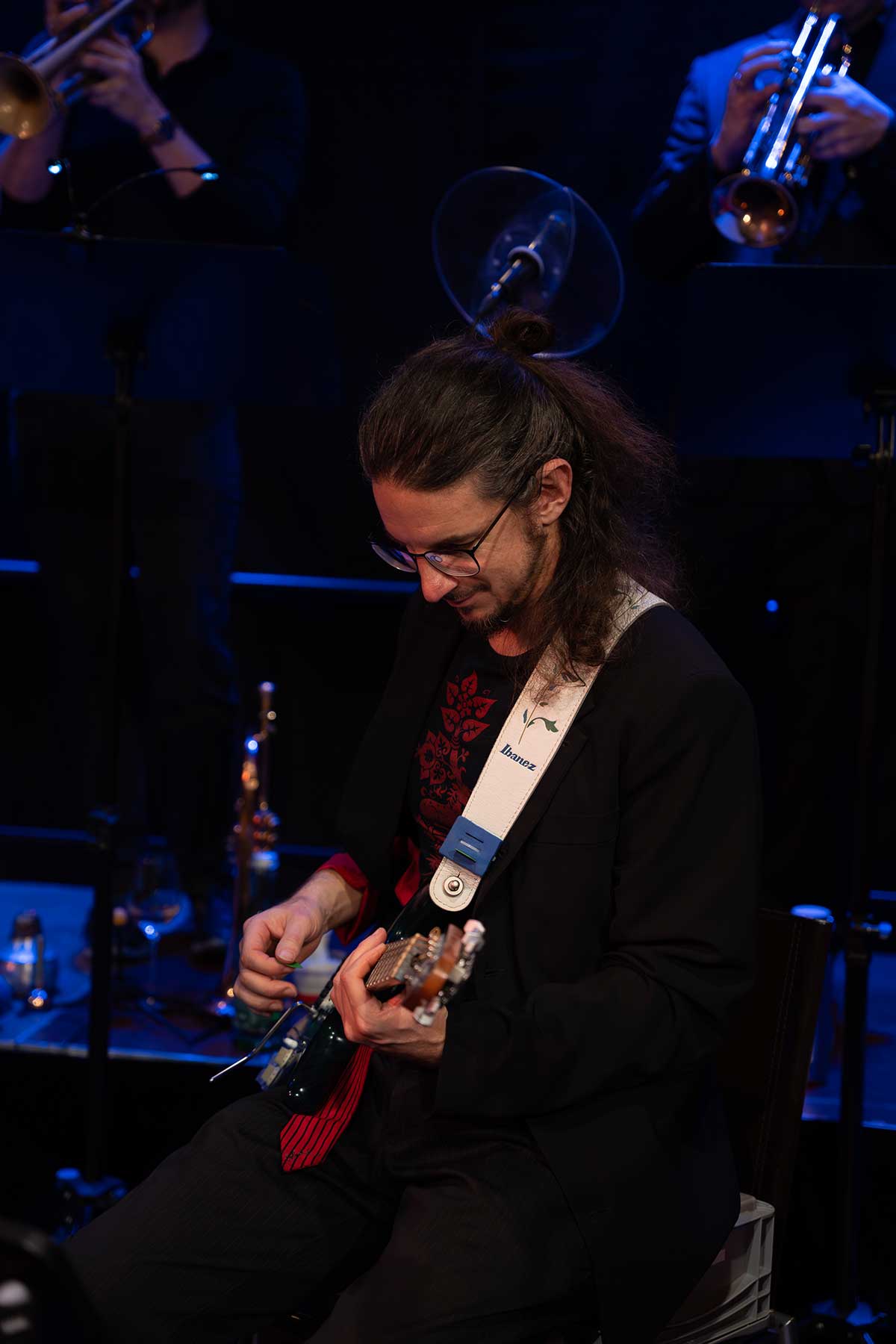 Mittendrin und an vorderster Front: Lorenz Raab, Freund und Wegbegleiter von Bandleader Alois Aichberger, der mit seiner Trompete malte wie andere mit Aquarellfarben. Ebenso großartig: Julia Sitz, die mit ihrer Stimme die vielfältigen Stücke veredelte und damit für einige der vielen Gänsehautmomente des Abends sorgte. Einer der berührendsten Momente war sicher „Die notwendige Reise“ – eine Komposition für Sprecher (Peter Hofmayer) und Big Band über Menschen auf der Flucht, aus dem Album „Sounds of Kosovo“. Inmitten aller Feierlichkeit ein nachdenklicher, emotionaler, intensiver Moment.